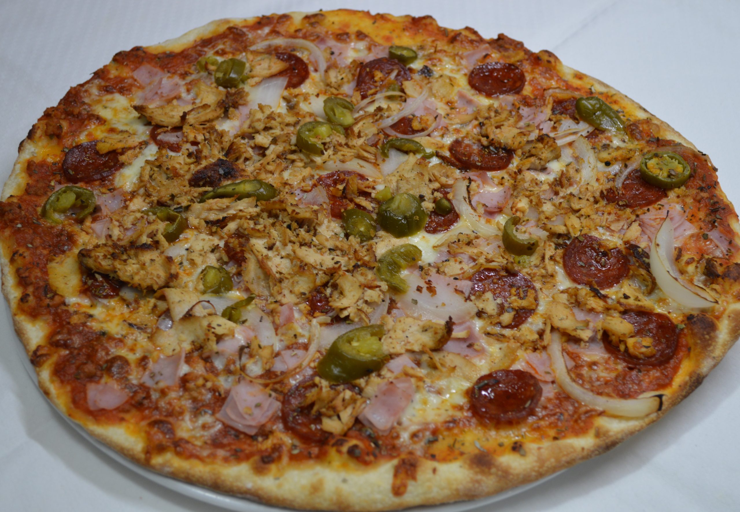 bolognai mártás, mozzarella, paprikás szalámi, sonka, csirkemell, hagyma, chili
