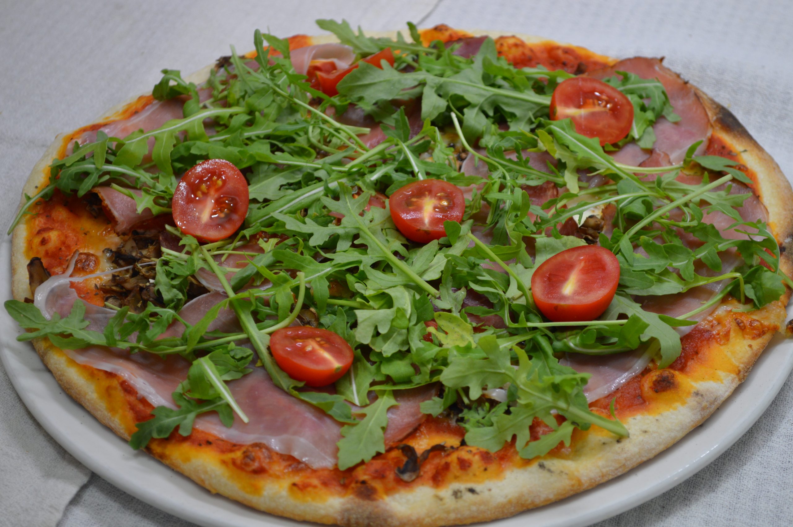 paradicsom, friss mozzarella-gombóc, gomba, speck sonka, rukkola, koktélparadicsom