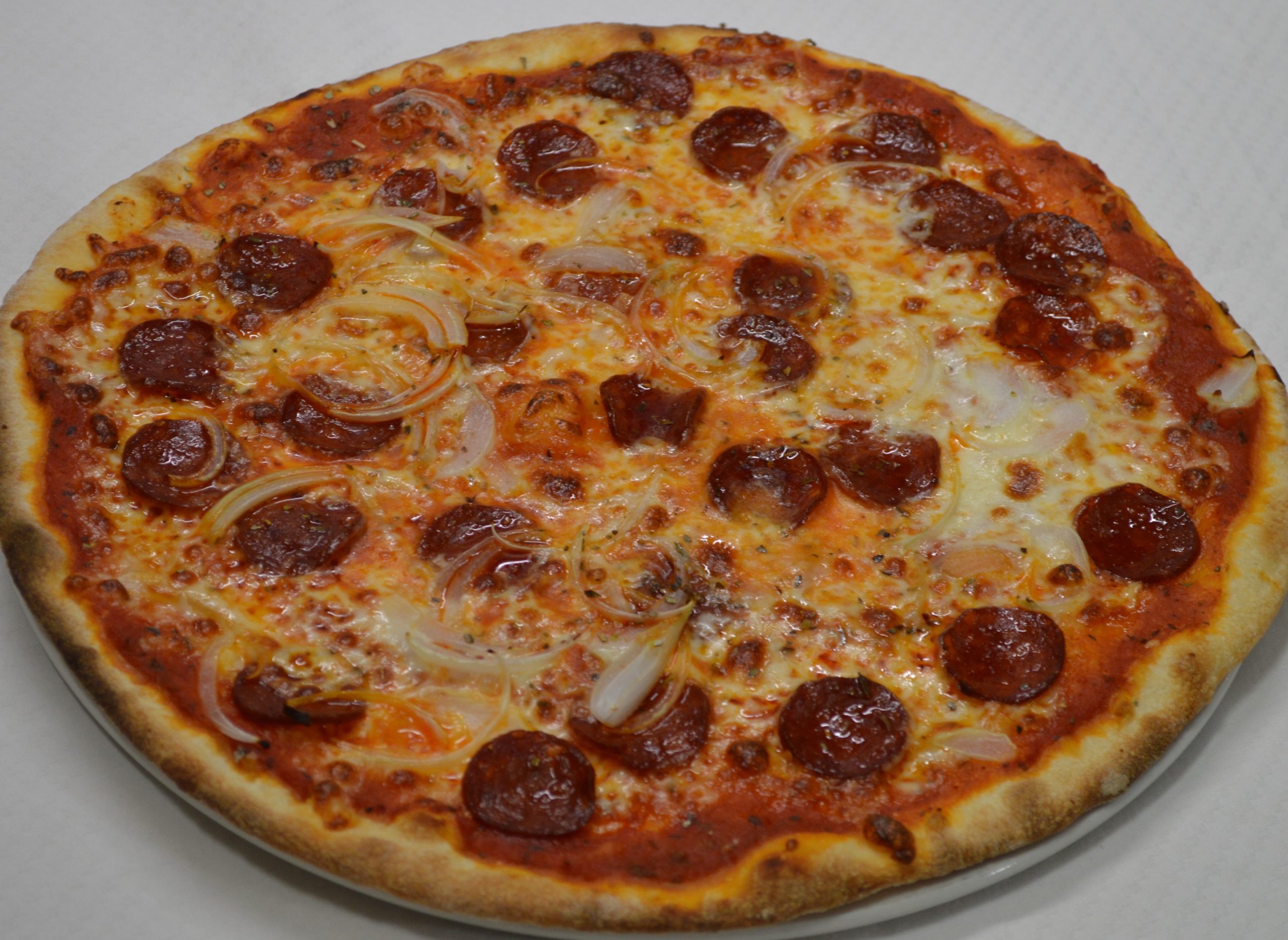 paradicsom, mozzarella, paprikás szalámi, hagyma