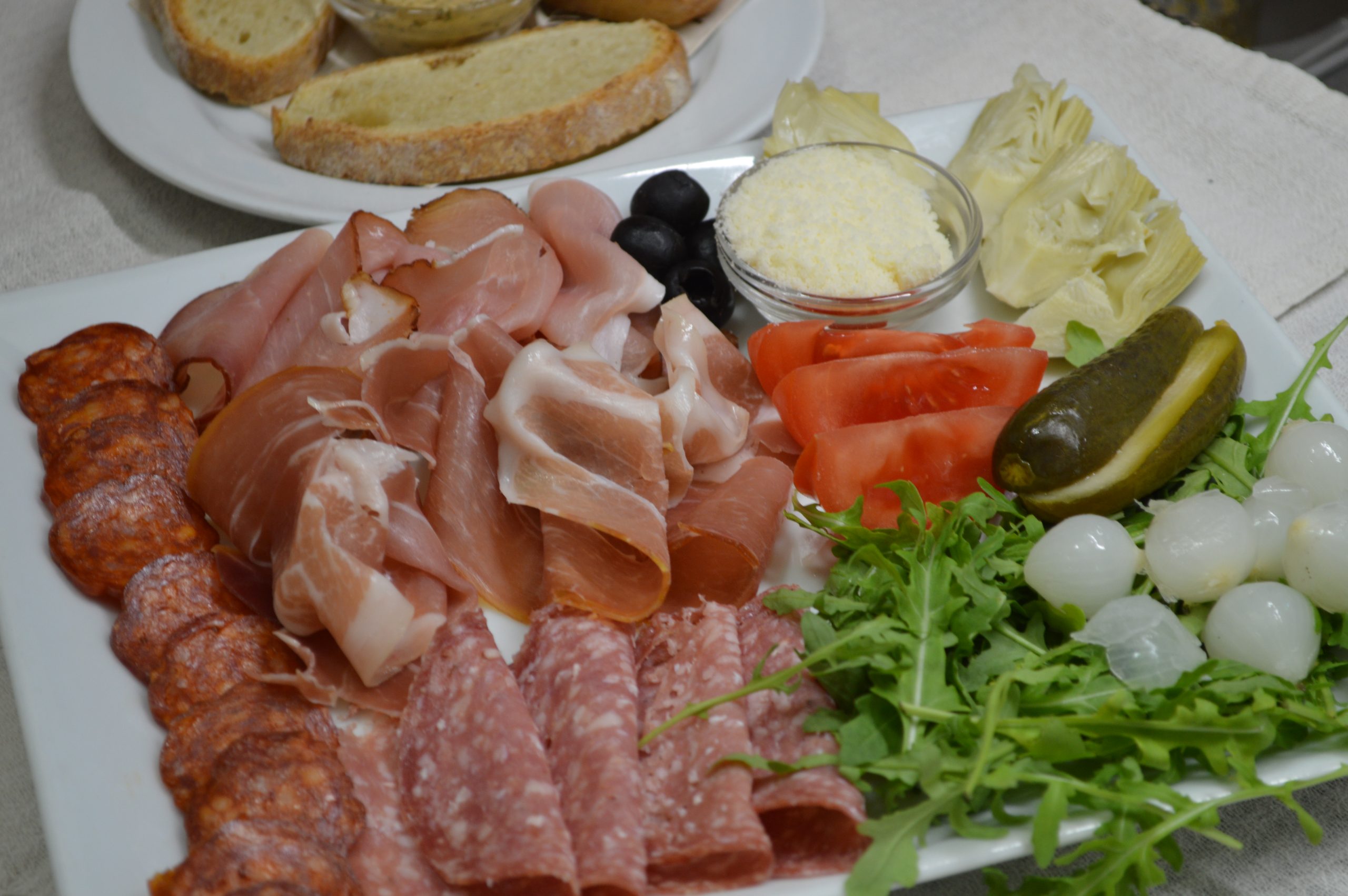 olasz bőségtál: pármai sonka, milánói szalámi, paprikás szalámi, parmezán, speck sonka, olívabogyó, articsóka, savanyúság, házi kenyér fűszervajjal
