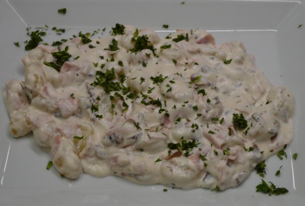 burgonyás gnocchi, tejszín, sonka, gomba, parmezán