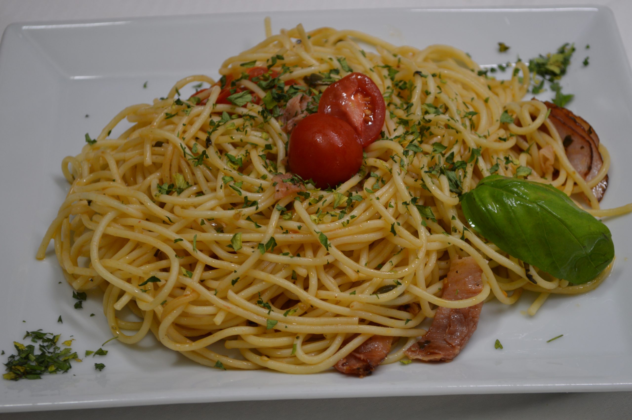 spagetti, bazsalikomos extra szűz olívaolaj, petrezselyem, koktél paradicsom, speck sonka