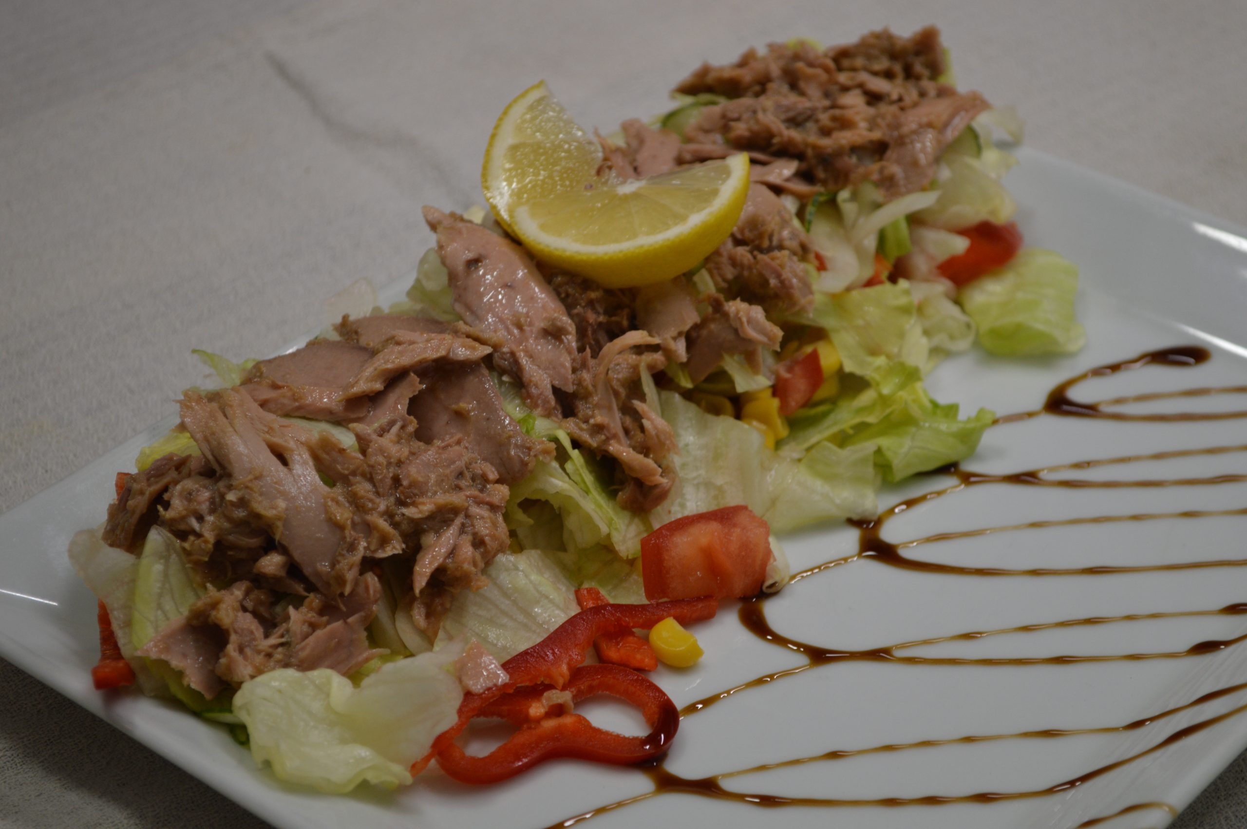 tonhal, kukorica, hagyma, jégsaláta, paradicsom, uborka, paprika, olívabogyó