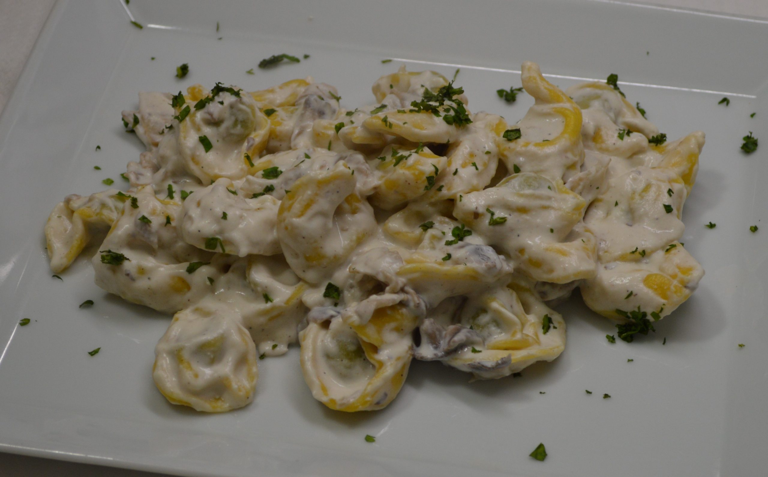spenóttal és ricotta sajttal töltött tortellini, tejszín, gomba, parmezán